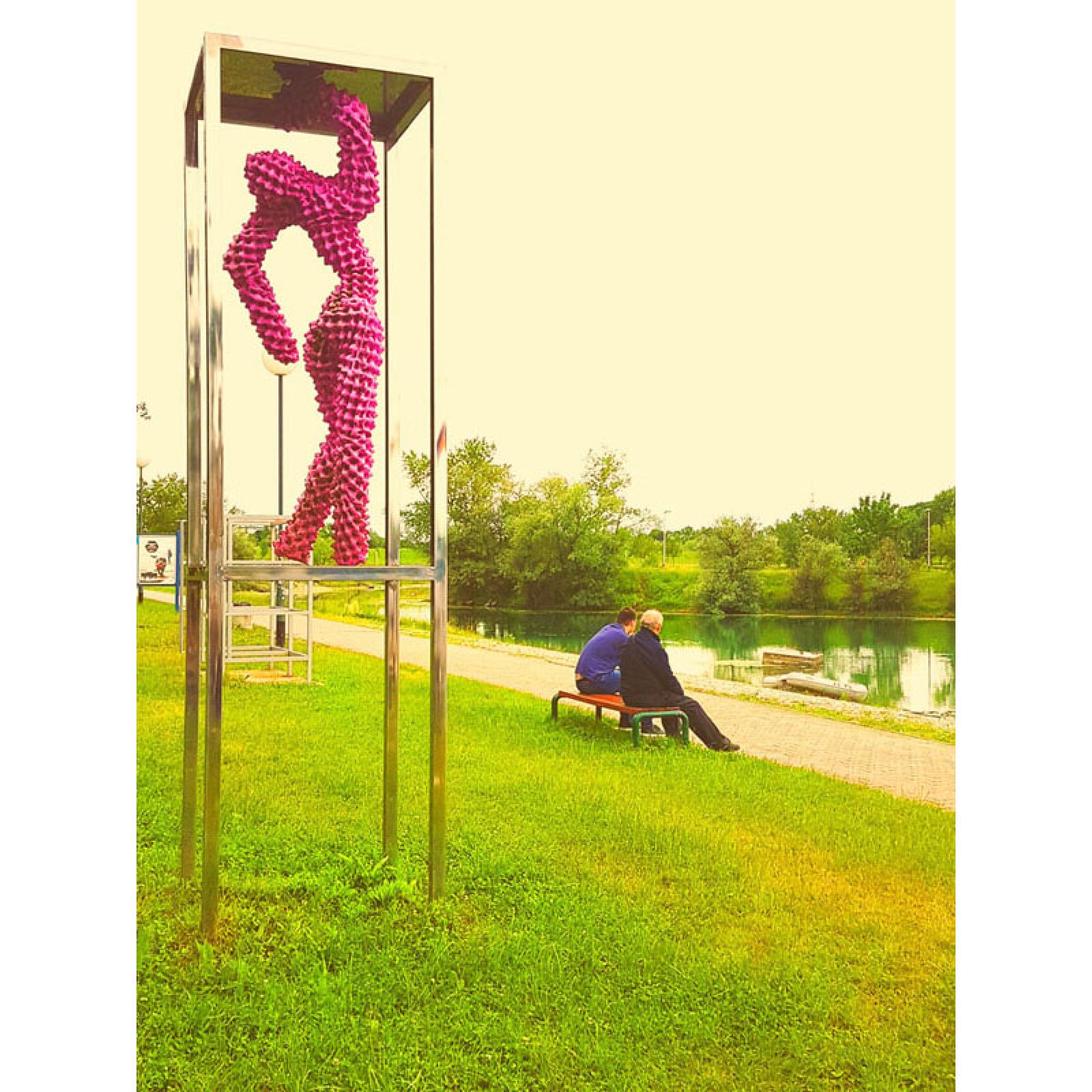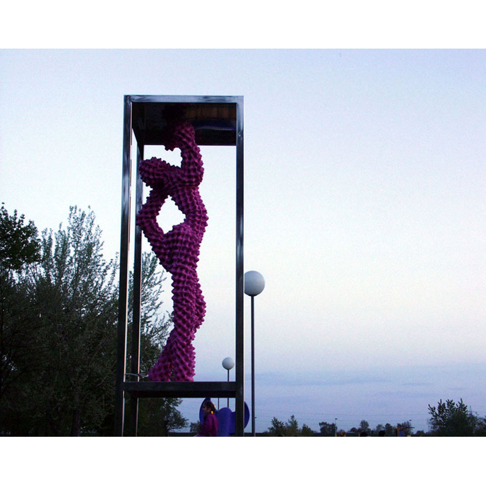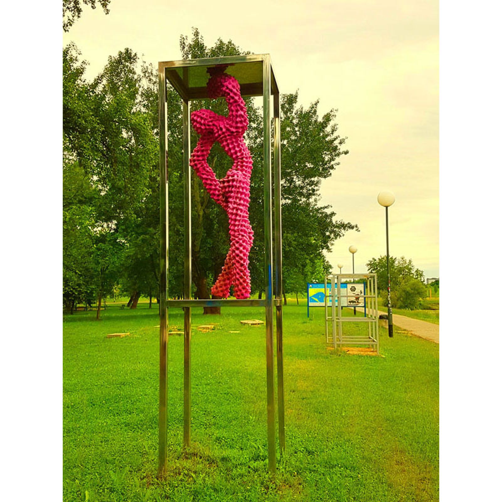 Skulptura je izvedena procesom recikliranja kartonske ambalaže za jaja, oslanjajući se na ideje arte povera. Upotrebom potrošnog materijala suptilno sugerira na sveopći komercijalizam suvremenog društva, te kroz sofisticirani plesni pokret figure zatočene u plesnom kavezu vuče paralelu između subkulture noćnog života kluba ispred kojeg je skulptura postavljena i sveprisutnog konzumerizma suvremene populacije.
